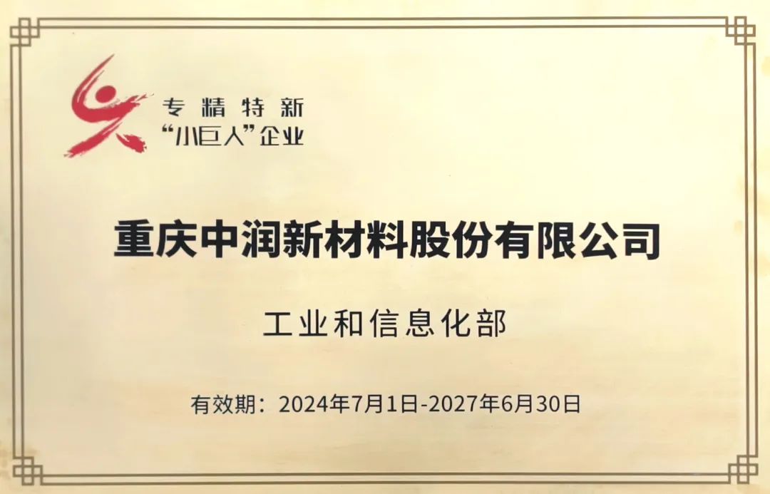 今日,由工业和信息化部组织的国家级专精特新“小巨人”企业认定工作中,重庆中润新材料股份有限公司获评国家级专精特新“小巨人”企业。是公司继获评“国家绿色工厂”后的又一国家级荣誉认证!这不仅是对中润新材在技术创新、产品研发、质量效益等方面的肯定,也是公司发展历程中的一个重要里程碑,更标志着公司在细分领域的创新力与竞争力得到了国家层面的高度认可。