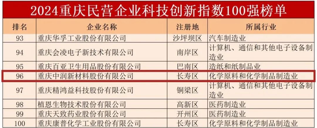 重庆中润新材料股份有限公司荣登2024重庆民营企业科技创新指数100强榜单。